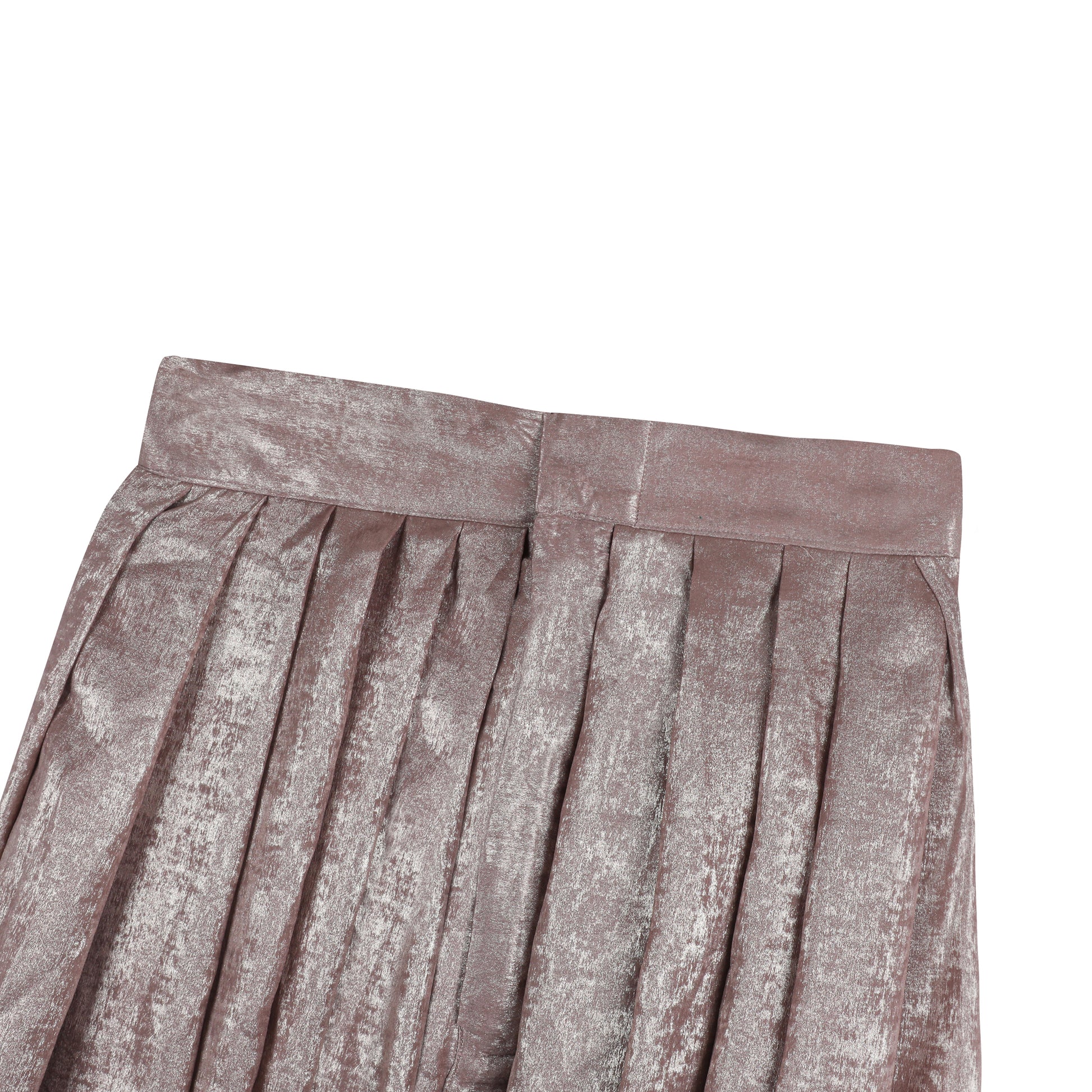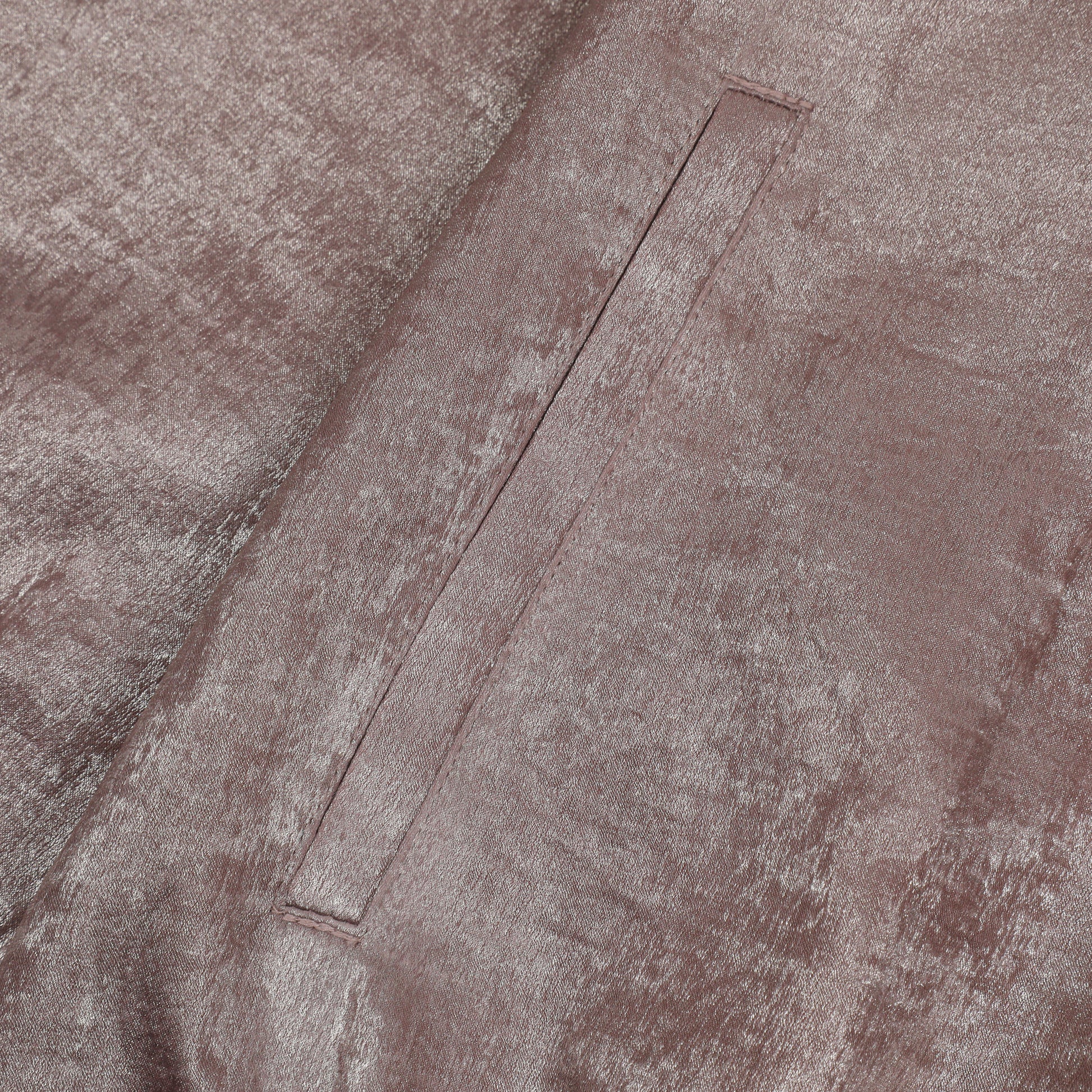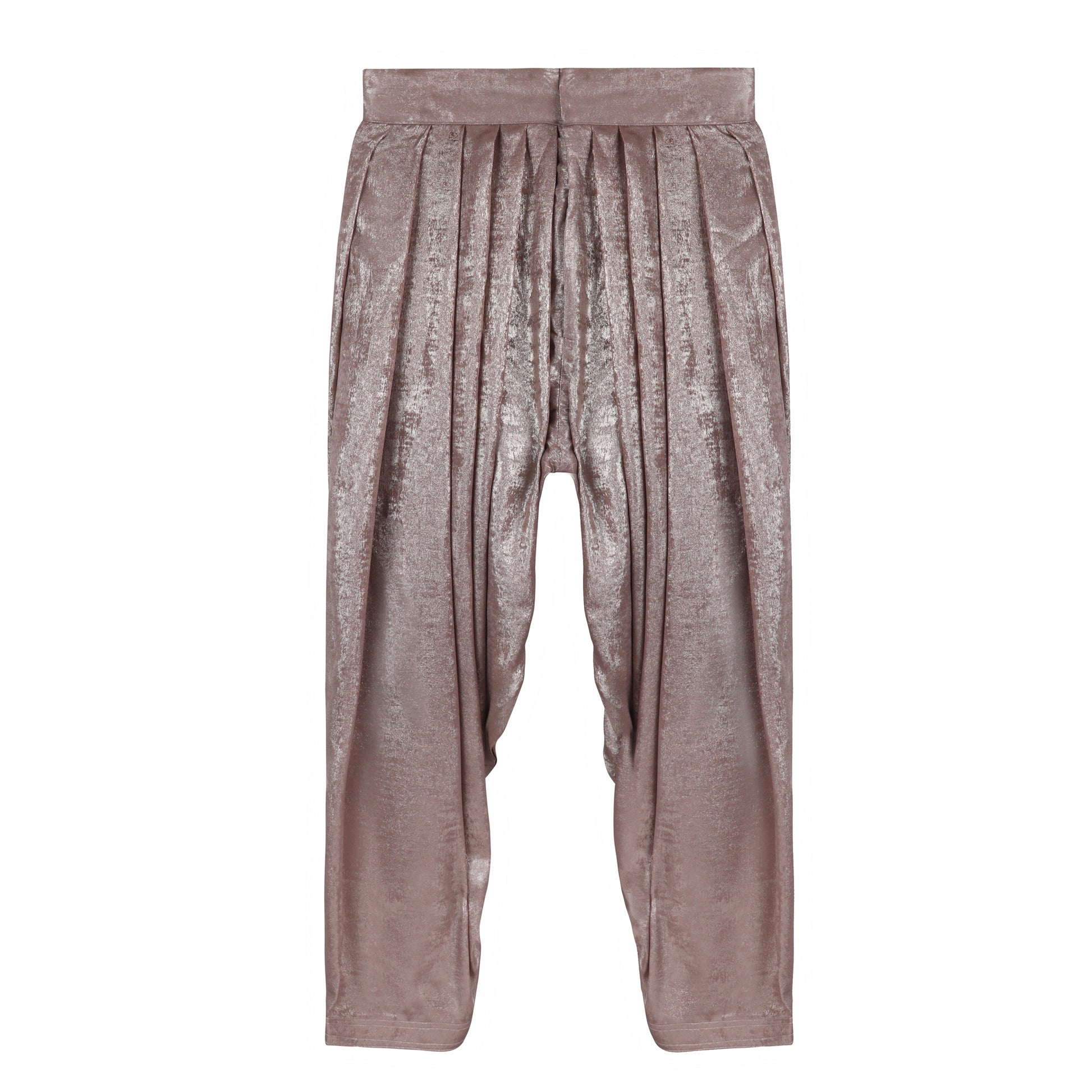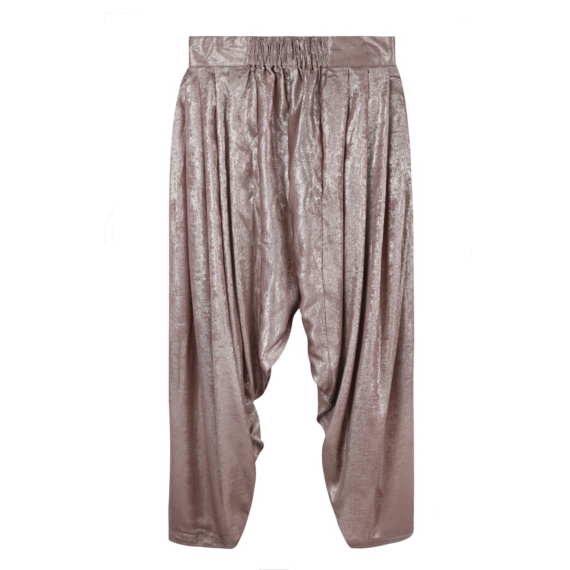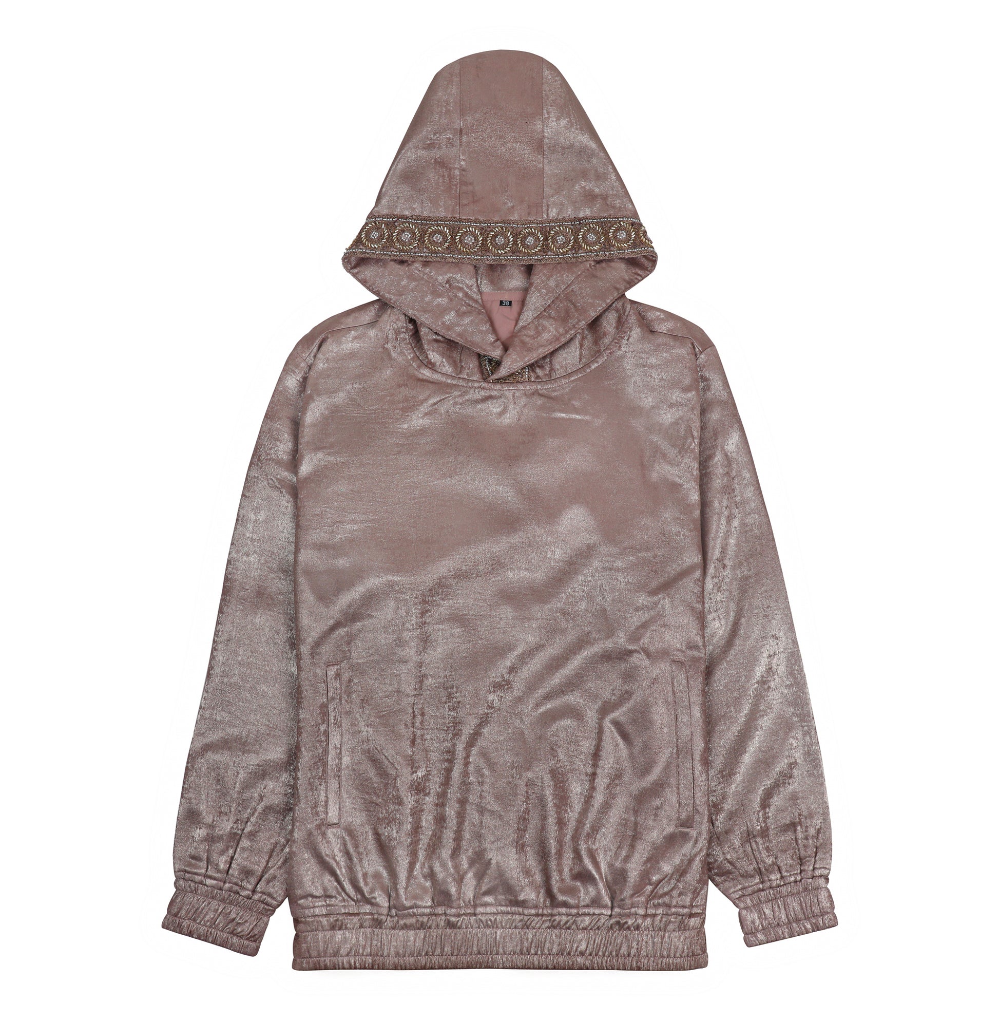 A soft-shine two-piece set with a hooded pullover and draped dhoti-style pants, cut in a light copper-beige tone with a brushed metallic finish.