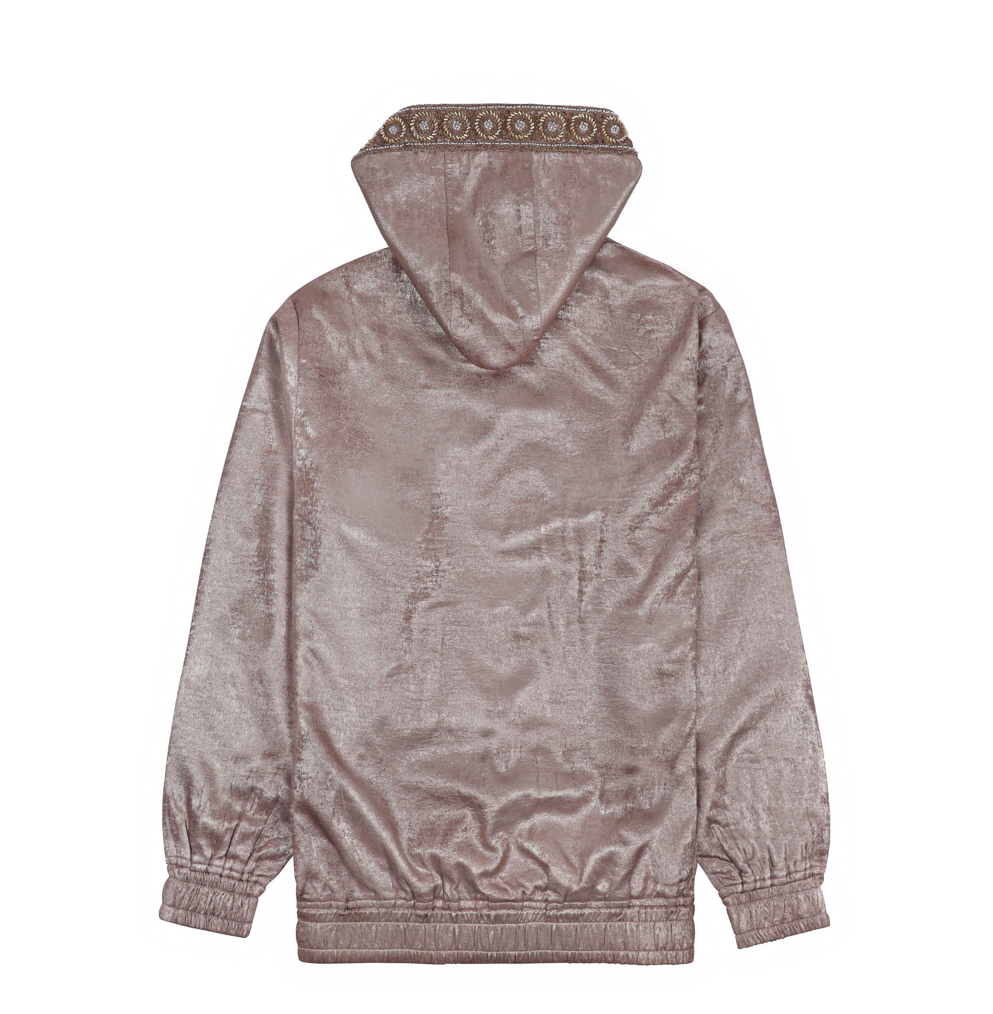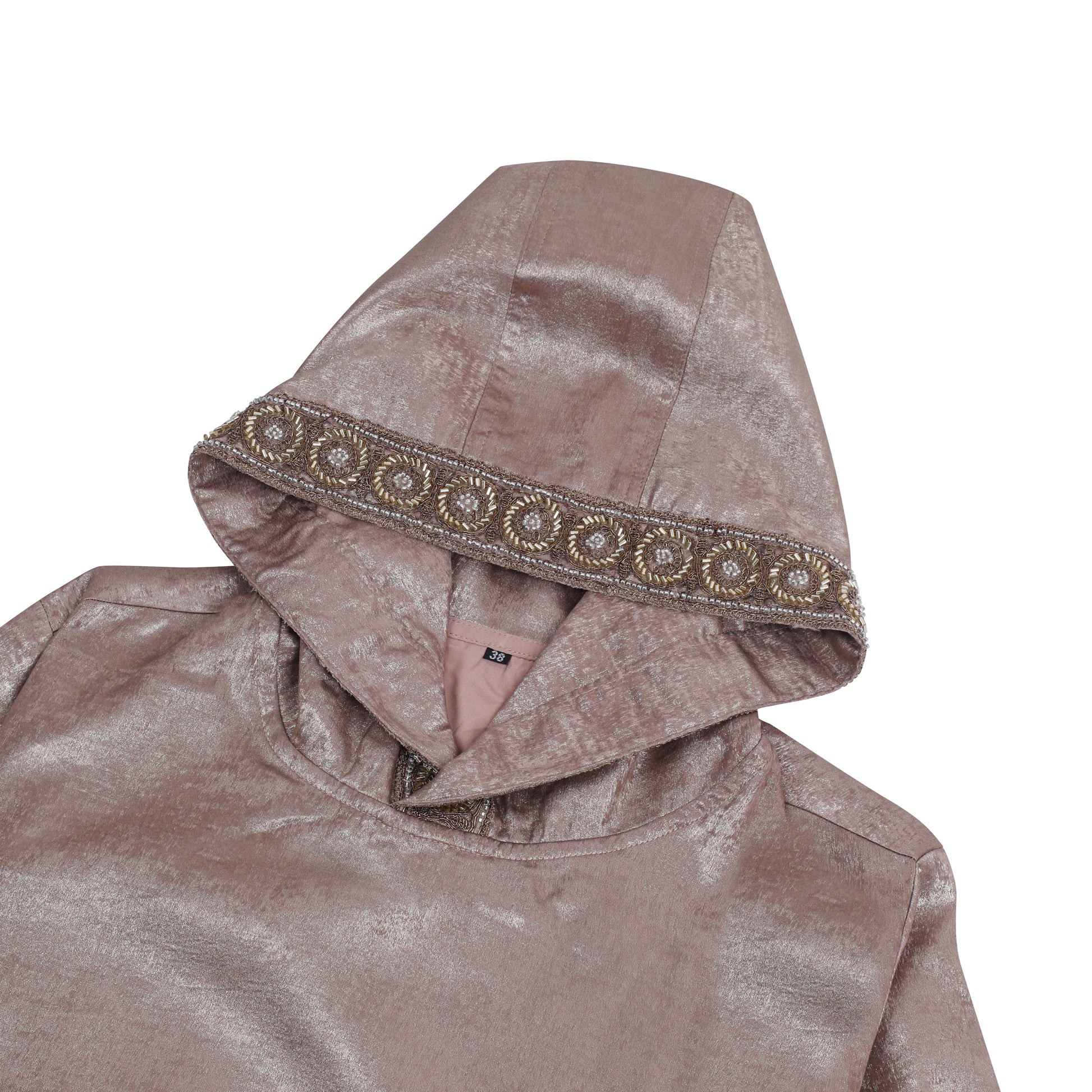 The top has an easy, relaxed shape with front welt pockets, gathered cuffs and hem, and embellished trim along the hood edge that adds a ceremonial glint.