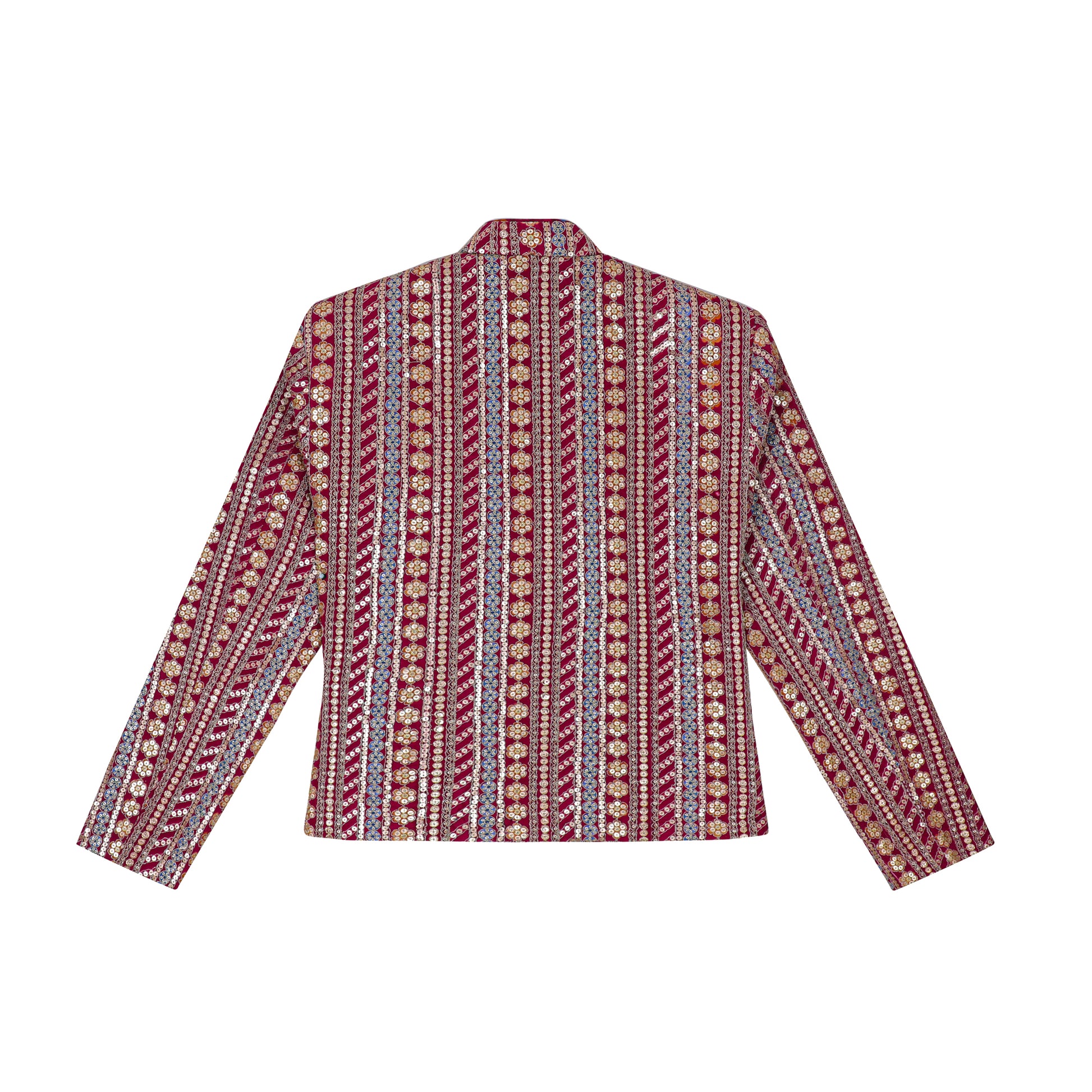 A cropped statement jacket cut in a clean, collarless silhouette and covered in richly layered surface work.